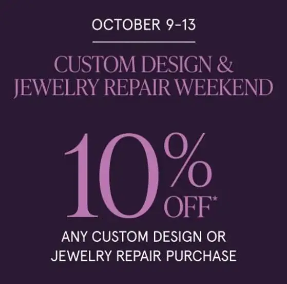 *Offer Valid October 9 - October 13, 2025. Only available in store during the Custom Design & Jewelry Repair Weekend. Applicable on in-store care, repair or custom design purchases only. Excludes loose diamonds and gemstones.