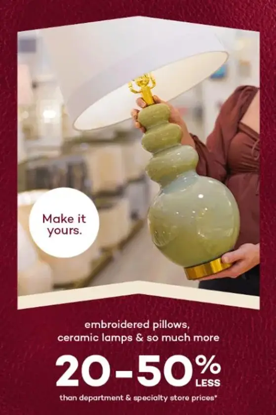 Limited time only! Shop in store and get 20-50% less on embroidered pillows, ceramic lamps & so much more.