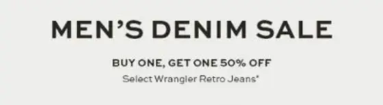 Hurry in and save big! Shop in store and enjoy our buy one, get one 50% off on select Wrangler Retro Jeans.