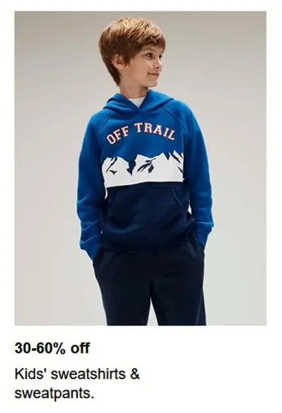 Limited time only! Shop in store and get 30-60% off kids' sweatshirts & sweatpants.
