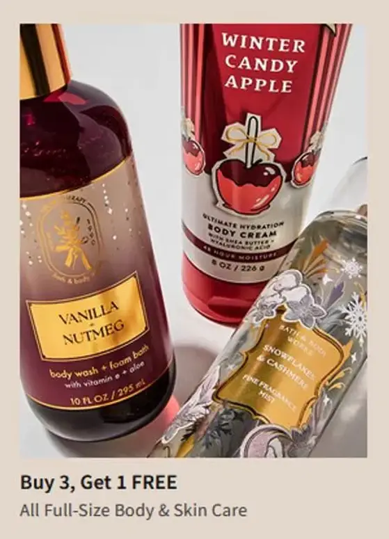 Don't miss out! Shop in store and enjoy buy 3, get 1 free all full-size body & skin care.
